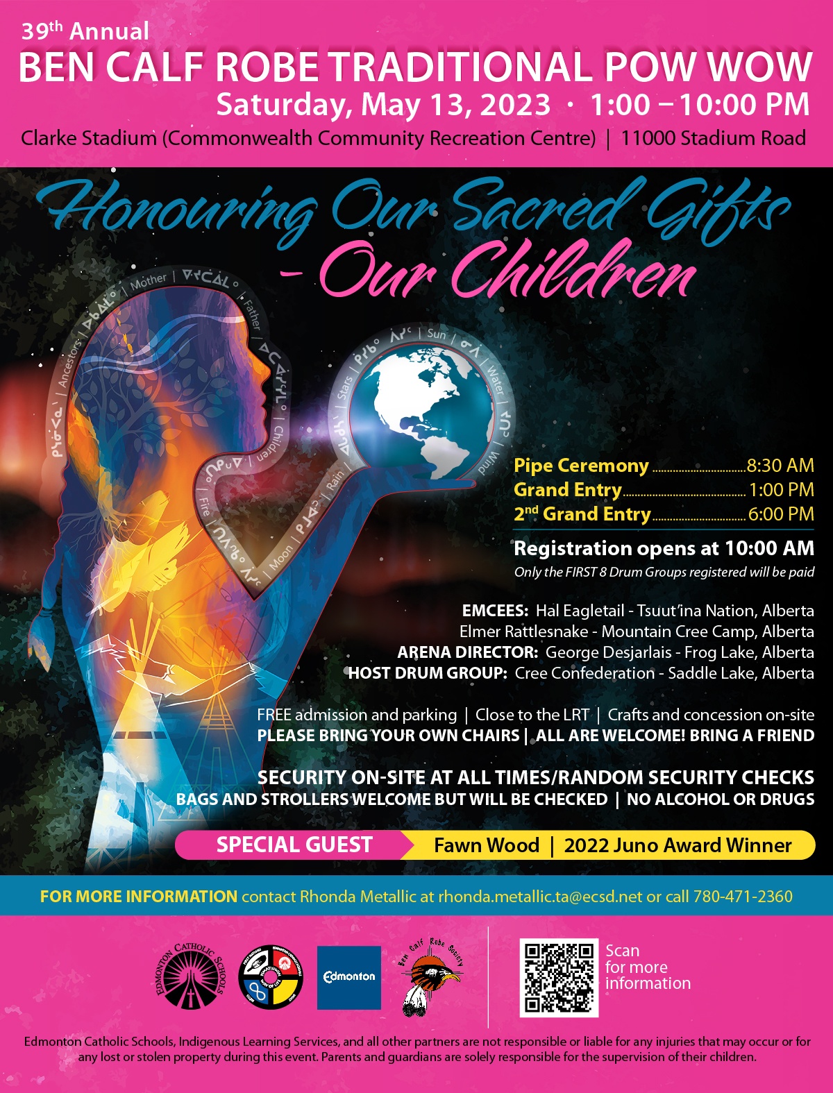 Edmonton Catholic Schools and Indigenous Learning Services, in partnership with the City of Edmonton, invite all Edmonton and surrounding community members to join us for our 39th Annual Ben Calf Robe Traditional Powwow